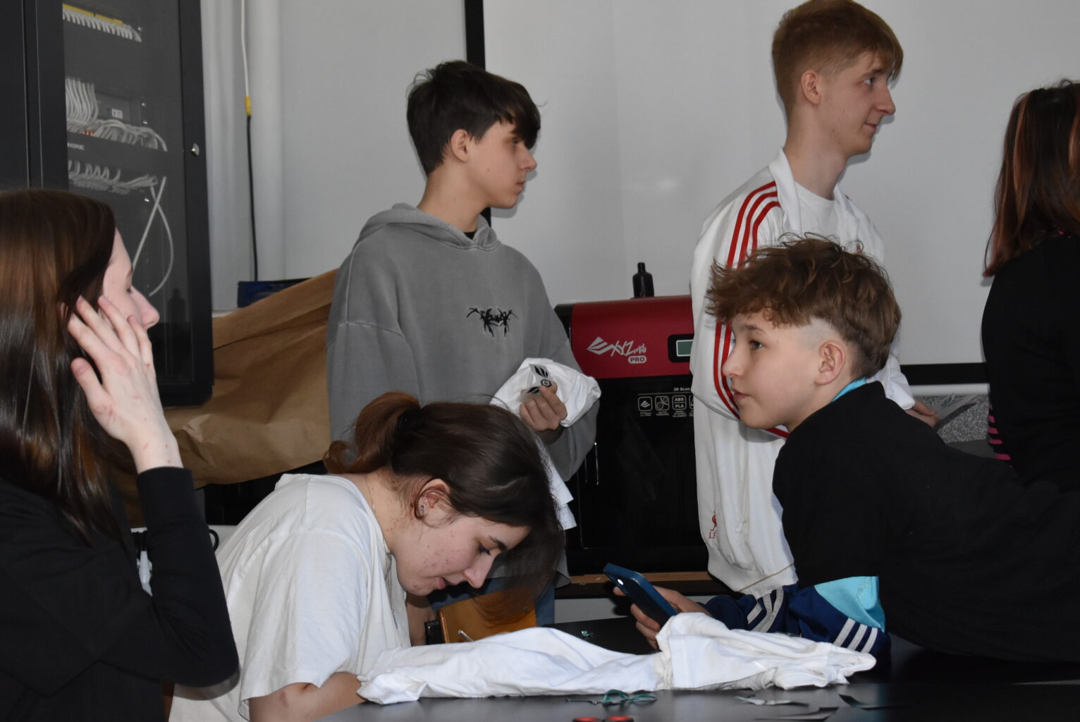 Warsztaty z produkcji koszulek dla klasy pierwszej technikum grafiki i poligrafii cyfrowej. Uczniowie mogli wybrać wzór z logo lub nawiązujący do logo szkoły, a następnie przeszli wszystkie niezbędne etapy, aby powstała koszulka ze znakowaniem, które jest trwałe. Na tych samych zajęciach uczniowie składali teczki, które będą do wygrania w różnych drobnych konkursach szkolnych.