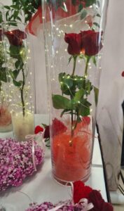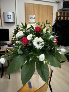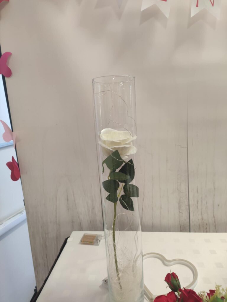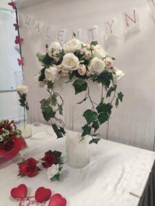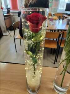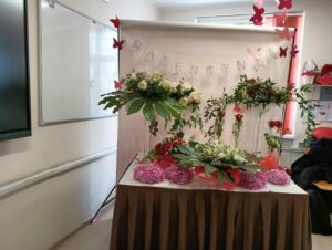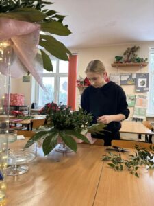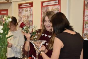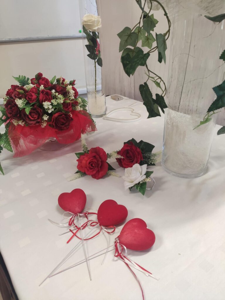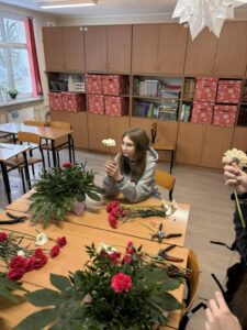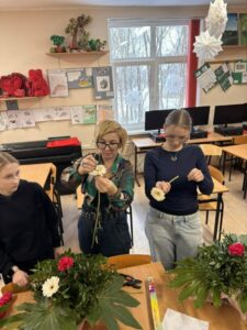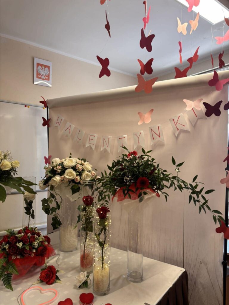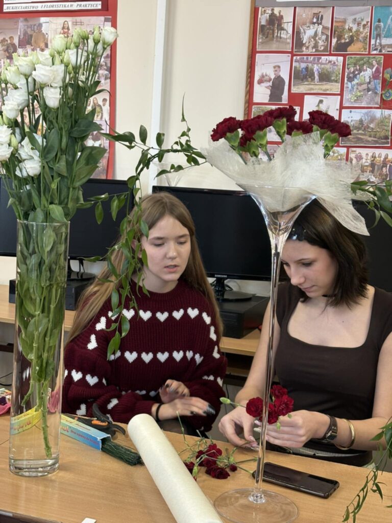 W aranżacjach dominowała klasyczna, walentynkowa kolorystyka oparta na odcieniach czerwieni i bordo, uzupełniona subtelnymi akcentami bieli i kremu. Uczniowie wykorzystali bogaty materiał roślinny, m.in. róże, goździki, gerbery, lilie, eustomy oraz gipsówkę, a także zieleń dekoracyjną w postaci ruscusu, pistacji i aralii. Starannie dobrane elementy stworzyły harmonijne, estetyczne kompozycje o wysokich walorach dekoracyjnych. Wszystkie prace zostały wykonane z dużą dbałością o szczegóły, proporcje oraz zasady kompozycji florystycznej, co potwierdza wysoki poziom przygotowania zawodowego uczniów. Gotowe aranżacje utworzyły walentynkową wystawę prac uczniowskich, która spotkała się z dużym zainteresowaniem społeczności szkolnej. Realizacja tego typu działań w ramach projektu unijnego stanowi ważny element kształcenia zawodowego — łączy teorię z praktyką, rozwija kompetencje przyszłych specjalistów oraz przygotowuje uczniów do realnych wyzwań rynku pracy. Projekty edukacyjne tego typu umożliwiają młodzieży zdobywanie doświadczenia, rozwijanie pasji oraz prezentowanie swoich umiejętności w autentycznych sytuacjach zawodowych.