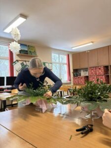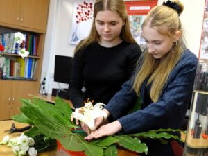 W ramach realizowanego projektu unijnego „Zawodowo i profesjonalnie w szkołach z powiatu chełmińskiego” (FEKP.08.16-IZ.00-0004/24), współfinansowanego przez Unię Europejską, uczniowie technikum architektury krajobrazu wzięli udział w wyjątkowym przedsięwzięciu rozwijającym kompetencje zawodowe i kreatywność. Dnia 16 lutego, podczas obchodów w naszej szkole walentynek, młodzież przygotowała efektowne kompozycje, które stały się ozdobą szkolnej przestrzeni. Zajęcia miały charakter praktycznych warsztatów florystycznych, umożliwiających uczniom doskonalenie umiejętności projektowania i wykonywania aranżacji roślinnych zgodnie z zasadami sztuki florystycznej. Kompozycje powstawały w różnorodnych naczyniach dekoracyjnych — tubach, martinówkach oraz paterach — co pozwoliło uczestnikom na zastosowanie różnych form i układów przestrzennych.