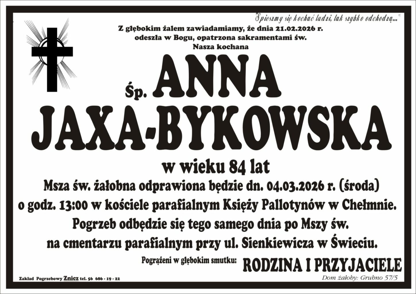 Z głębokim żalem zawiadamiamy o śmierci śp. Anny Jaxy-Bykowskiej