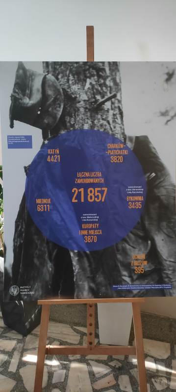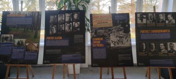 Zbrodnia katyńska to zbiorcza, symboliczna nazwa odnosząca się do zamordowania wiosną 1940 r. około 22 tys. Polaków w kilku miejscach na terenie Związku Radzieckiego. Wśród tej liczby było prawie 15 tys. oficerów Wojska Polskiego i Policji Państwowej. Decyzję podjęły najwyższe władze ZSRS na mocy tajnej uchwały Biura Politycznego KC WKP(b) z 5 marca 1940 r. Jedna z plansz wystawy pokazywała wspomniany dokument, na którym był podpis m.in. Stalina, Mołotowa, Woroszyłowa, Mikojana. Likwidację oficerów rekomendował szef NKWD Ławrentij Beria. Zbrodni dokonało NKWD, zabijając swe ofiary tuż nad dołami śmierci lub w budynkach więzień. Zabici to przedstawiciele polskich elit, cześć z nich jako oficerowie rezerwy była w życiu cywilnym prawnikami, profesorami, lekarzami, nauczycielami, przedsiębiorcami itp. Na jednej z plansz znajdowały się nazwiska i zdjęcia kilkorga z nich, w tym jedynej kobiety, podporucznika lotnictwa Janiny Lewandowskiej. Warto nadmienić, że wśród zabitych byli również oficerowie z chełmińskich przedwojennych pułków Wojska Polskiego. Wiosną 1943 r. Niemcy ujawnili tę zbrodnię, a celem ich propagandy było wbicie klina między Stalina a Anglosasów. Do rozejścia się dróg aliantów jednak nie doszło, Anglicy i Amerykanie nabrali wody w usta, ponieważ ZSRS dźwigający na swych barkach ciężar wojny w Europie był im potrzeby do walki z Hitlerem. Na planszy pt. Portrety katów, można było również zobaczyć morderców z NKWD, którzy zabijali polskich oficerów wiosną 1940 r. Po wojnie, w PRL-u Katyń był tematem tabu lub kłamstw na temat sprawstwa niemieckiego, i choć wielu Polaków znało prawdę o tym kto pociągał za spust nad dołami śmierci, to jednak dopiero w kwietniu 1990 r. Rosjanie przyznali się do tej zbrodni. Państwo polskie nie zapomniało o swych żołnierzach, policjantach i cywilach i każdego z nich opatrzyło na drogę z imienia i nazwiska, zgodnie z chrześcijańską tradycją, o czym świadczą pomniki i pamięć pokoleń. Na koniec należy nadmienić, że nikt, nigdy nie został pociągnięty do odpowiedzialności za dokonanie tego mordu. Piotr Sołtysiak