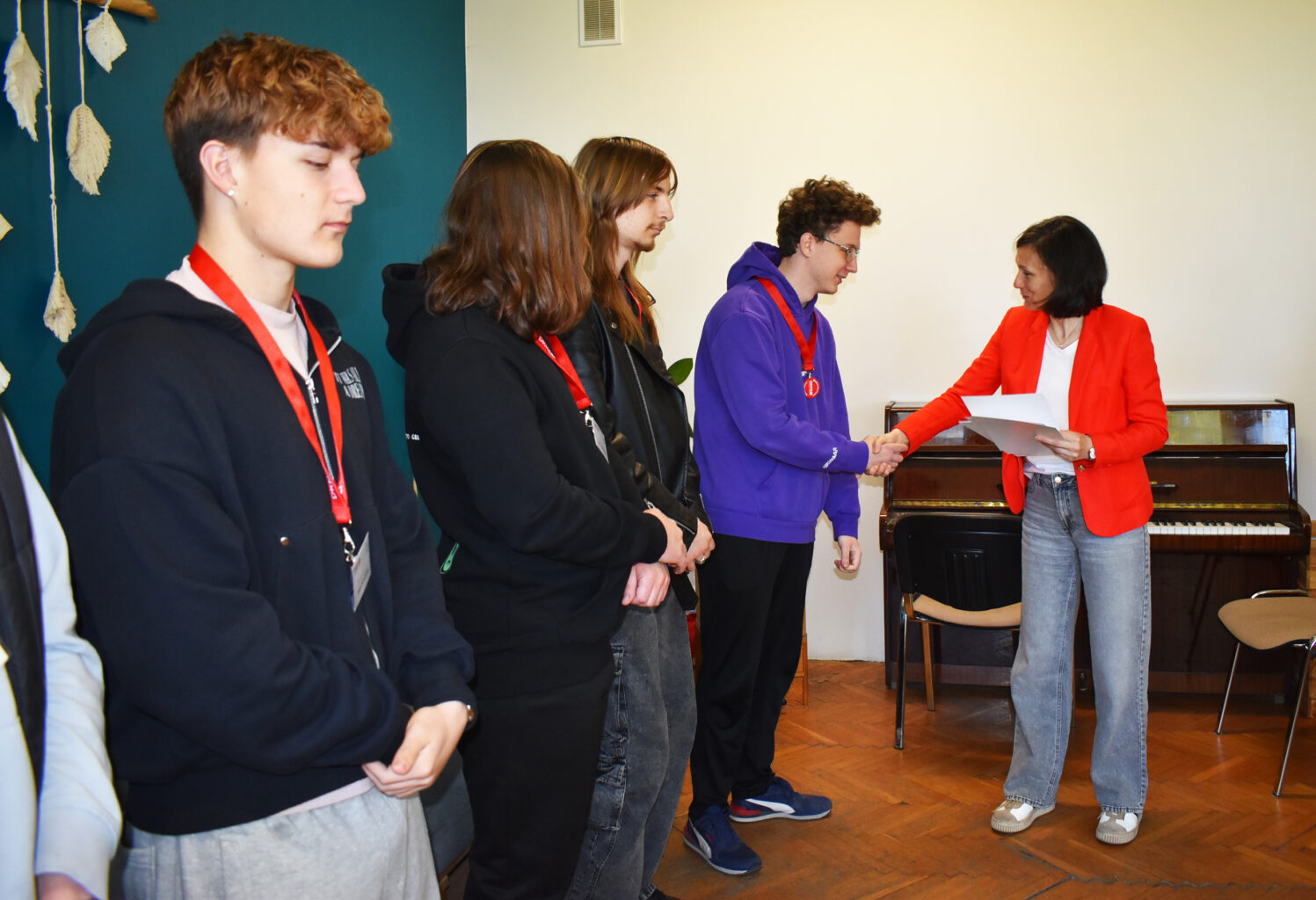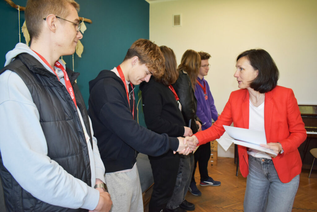 Dyrektor szkoły, pani Edyta Chrapińska, wręczyła certyfikaty wolontariuszom, którzy aktywnie angażowali się w działania promocyjne oraz koordynowali pracę punktów rejestracji dawców szpiku DKMS. Wyjątkowym punktem uroczystości było również wręczenie pamiątkowych „Smoków” ambasadorom akcji – osobom, których postawa i zaangażowanie stały się wizytówką tegorocznej edycji programu w naszej szkole.