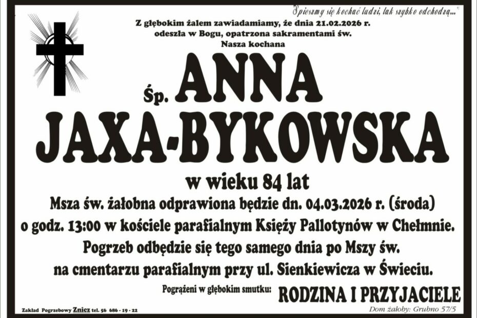 Z głębokim żalem zawiadamiamy o śmierci śp. Anny Jaxy-Bykowskiej